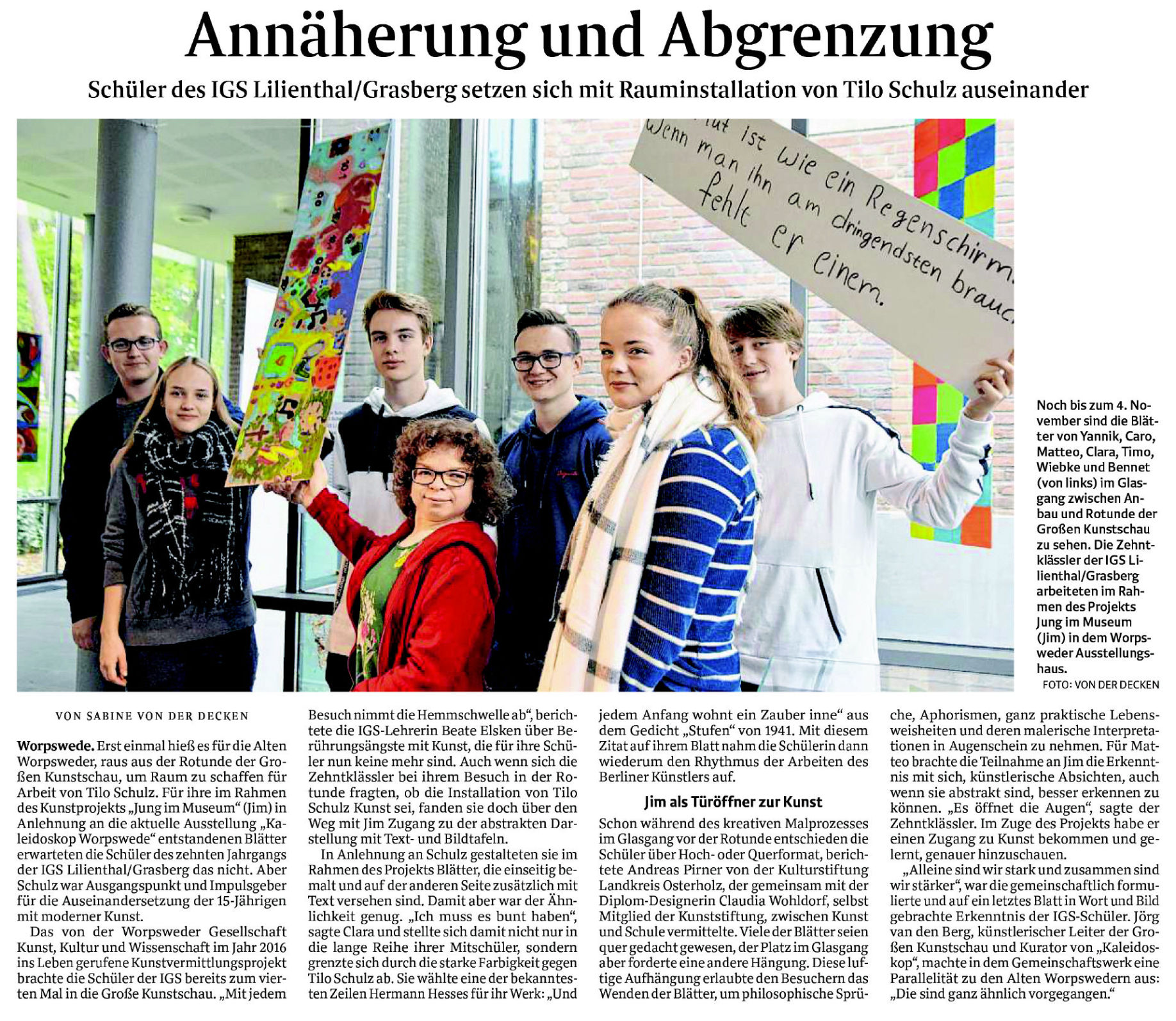 Im Spätherbst vergangenen Jahres wurden die Leitungen und Kunstlehrer regionaler Schulen eingeladen, gemeinsam mit der Großen Kunstschau und der Worpsweder Gesellschaft für Kunst, Kultur und Wissenschaft Ideen und Konzepte für eine Partnerschaft der Einrichtungen zu entwickeln.