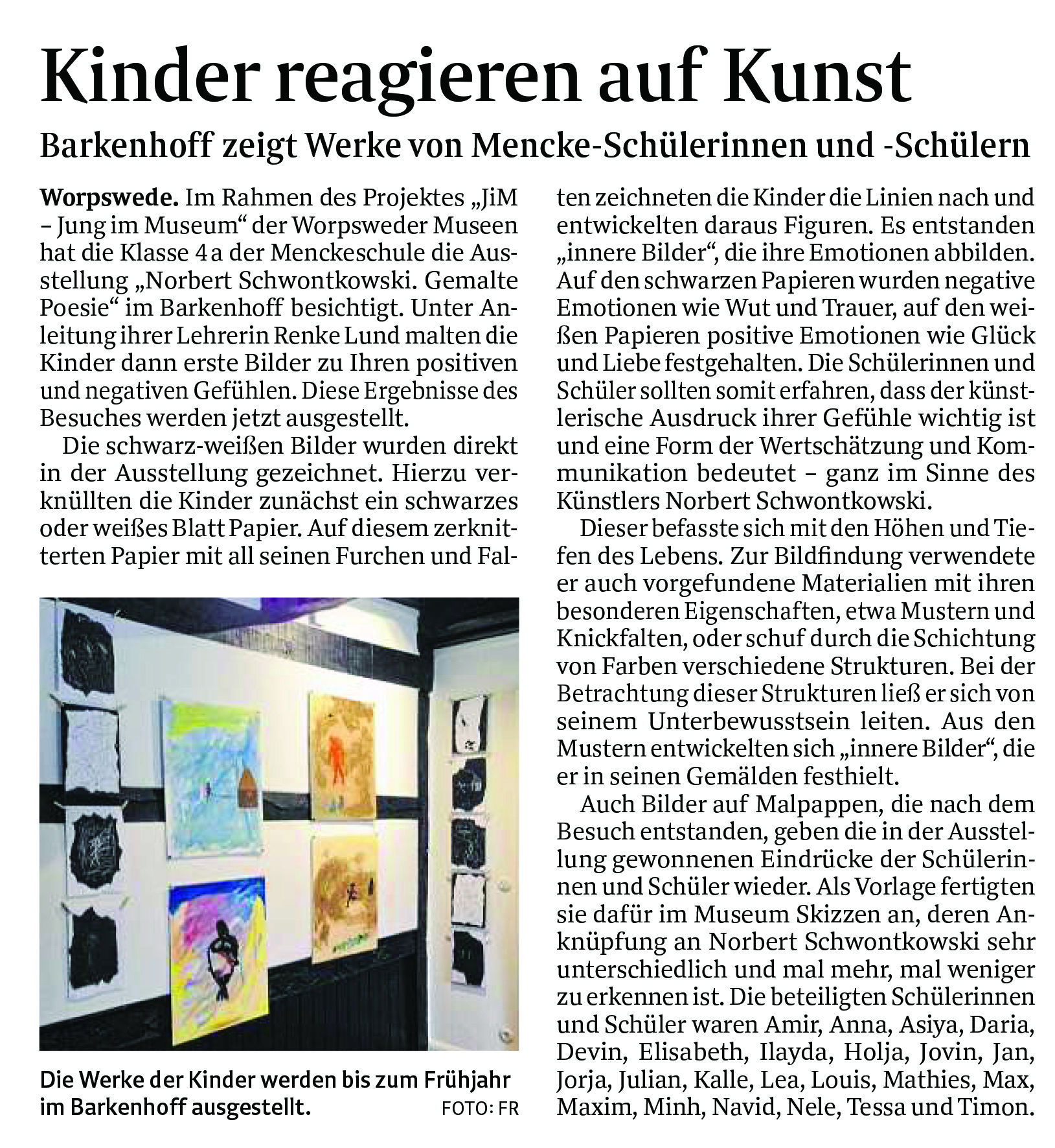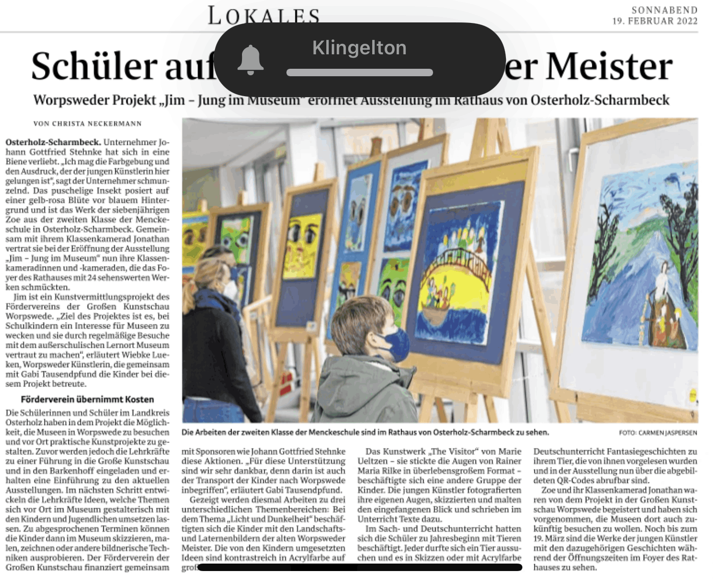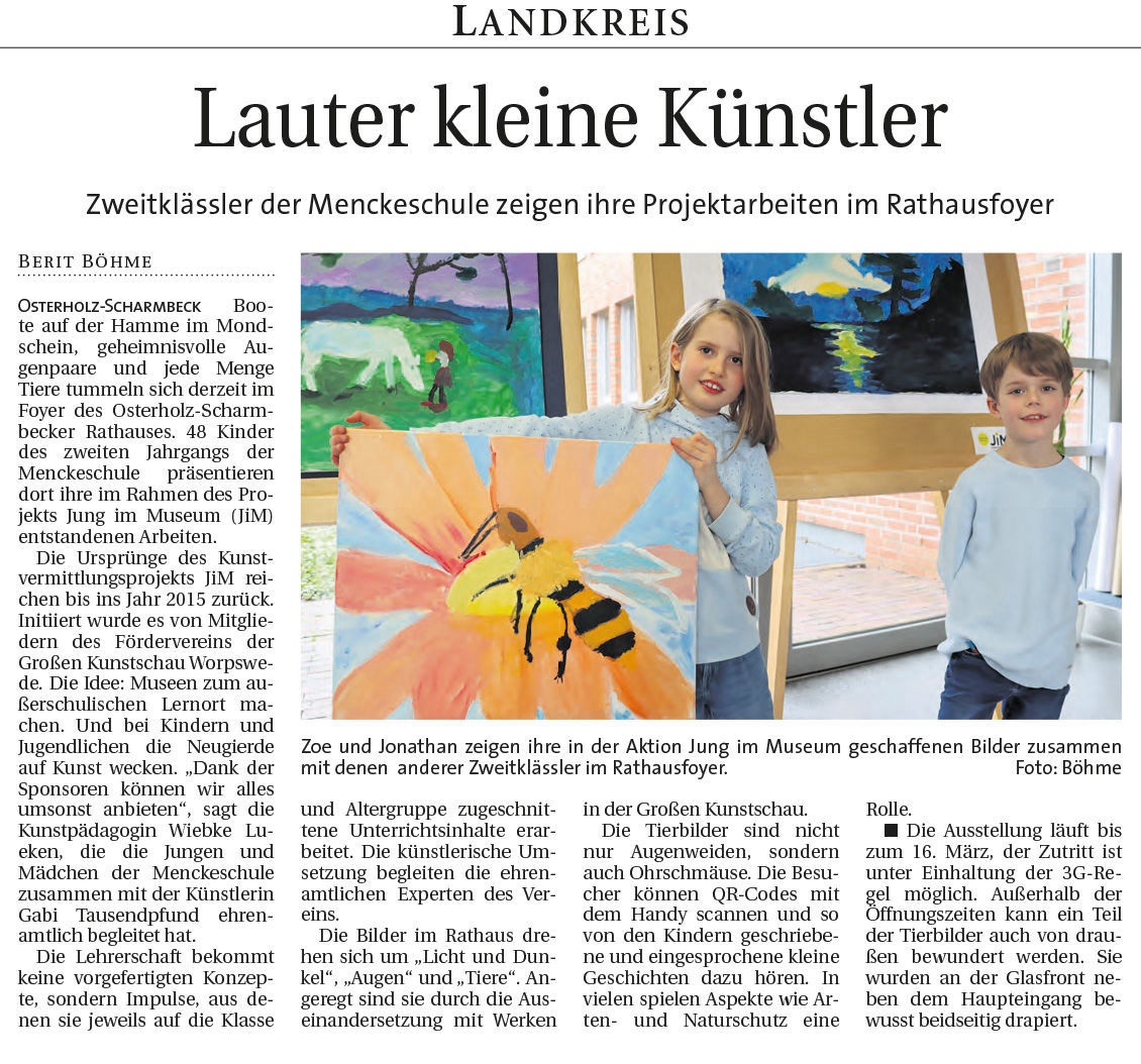 Zoe und ihr Klassenkamerad Jonathan waren von dem Projekt in der Großen Kunstschau Worpswede begeistert und haben sich vorgenommen, die Museen dort auch zukünftig besuchen zu wollen. Noch bis zum 19. März sind die Werke der jungen Künstler mit den dazugehörigen Geschichten während der Öffnungszeiten im Foyer des Rathauses zu sehen