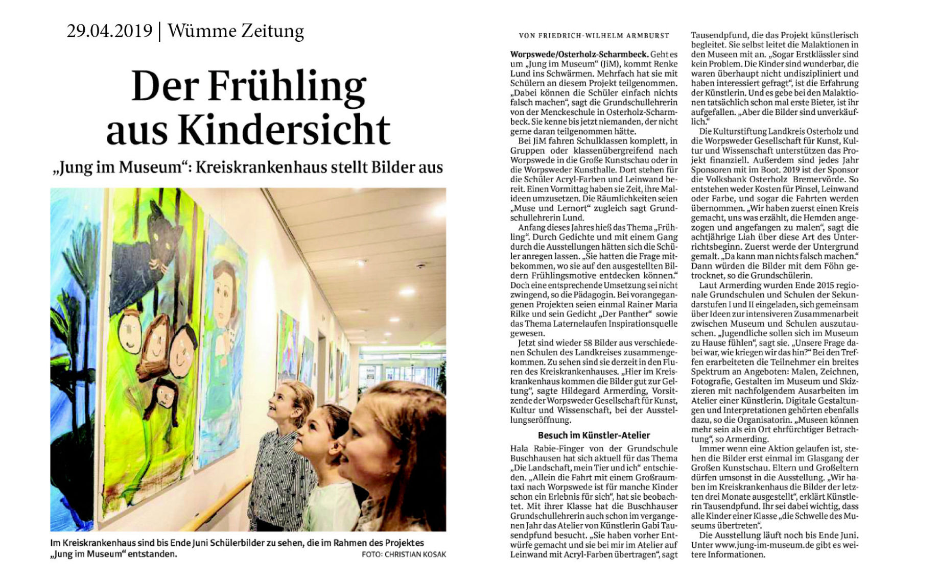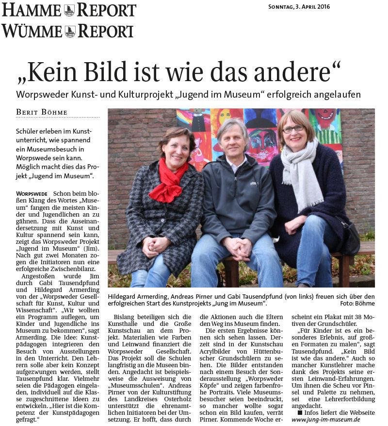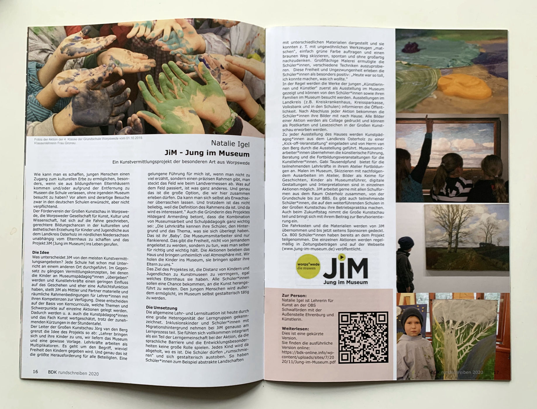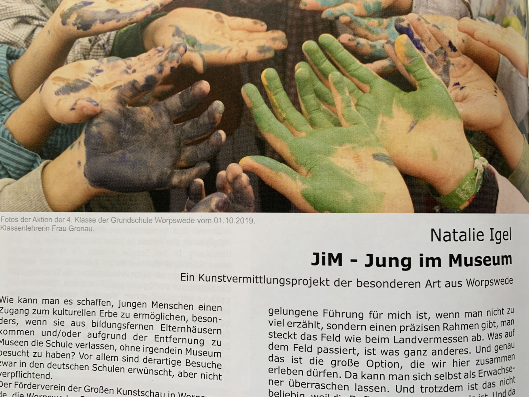 Jim ist ein Kunstvermittlungsprojekt des Fördervereins der Großen Kunstschau Worpswede. „Ziel des Projektes ist es, bei Schulkindern ein Interesse für Museen zu wecken und sie durch regelmäßige Besuche mit dem außerschulischen Lernort Museum vertraut zu machen“, erläutert Wiebke Lueken, Worpsweder Künstlerin, die gemeinsam mit Gabi Tausendpfund die Kinder bei diesem Projekt betreute.