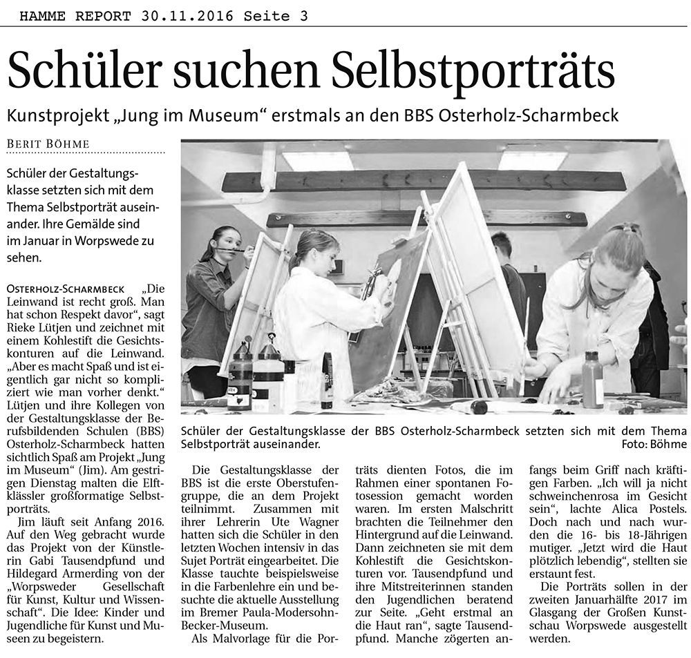 Zur Vorbereitung besuchten die FOS-Schüler die Liebermann-Ausstellung in der Bremer Kunsthalle und in der Böttcherstraße die Paula-Becker-Ausstellung. Dort holten sich die Jugendlichen Inspirationen für ihre eigenen Kunstwerke. „Für viele war es der erste Museumsbesuch“, erzählte die Fachbereichsleiterin Ute Wagner. Zwei Gruppen arbeiteten anschließend in den Unterrichtsräumen der BBS-Zweigstelle an der Osterholzer Bahnhofstraße. Dabei begleiteten die Kunstpädagogin Gabi Tausendpfund und der Worpsweder Künstler Hartmut Balke die Jugendlichen mit Tipps und Korrekturen.