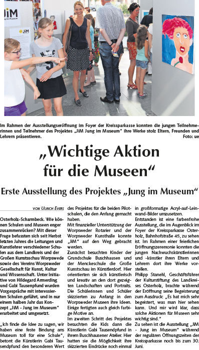 Zum Abschluss des ersten „JiM-Halbjahres“ gibt es auch eine öffentliche Präsentation der Bilder und Objekte, die im Museum entstanden sind. In der Hauptstelle der Kreissparkasse in Osterholz-Scharmbeck wird an diesem Montag, 6. Juni, um 16 Uhr die Ausstellung eröffnet.