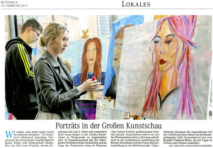 Wir wollen, dass mehr junge Leute ins Museum kommen.“ So formulierte Hildegard Amerding, Vorsitzende der Worpsweder Gesellschaft für Kunst, Kultur und Wissenschaft (KuKuWi), das Ziel eines Projekts, dessen Ergebnisse bis zum 5. März und vermutlich noch etwas länger in der Großen Kunstschau in Worpswede zu begutachten sind. In Zusammenarbeit mit der Osterholzer Fachoberschule Gestaltung und im Zuge des Programms Jung im Museum (Jim) hatten Schüler großformatige Porträts gemalt. Inspirationen hatten sie sich bei Museumsbesuchen in Bremen geholt, auch in der Liebermann-Ausstellung der Bremer Kunsthalle und der Paula-Becker-Ausstellung in der Böttcherstraße. Unterstützung bekamen die Jugendlichen bei der Umsetzung ihrer Ideen von der Kunstpädagogin Gabi Tausendpfund und vom Künstler Hartmut Balke, die mit Tipps zu Farben und Formen aushalfen.