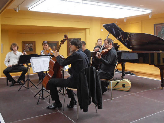 Um 12 Uhr und dann nochmal um 16 Uhr spielen Bertrand Chamayou in der Halle und gleichzeitig das Ensemble Contraste in der Rotunde. Ineiner Pause wechseln die jeweils rund einhundert Gäste ihre Plätze, wer erst Chamayou hörte lauscht nun dem Ensemble und umgekehrt.