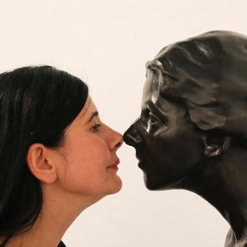 Abb.: Nezaket Ekici, Hauptpreisträgerin 2018, vor der Bronzebüste von Paula Modersohn-Becker, Foto: © Jost Wischnewski
