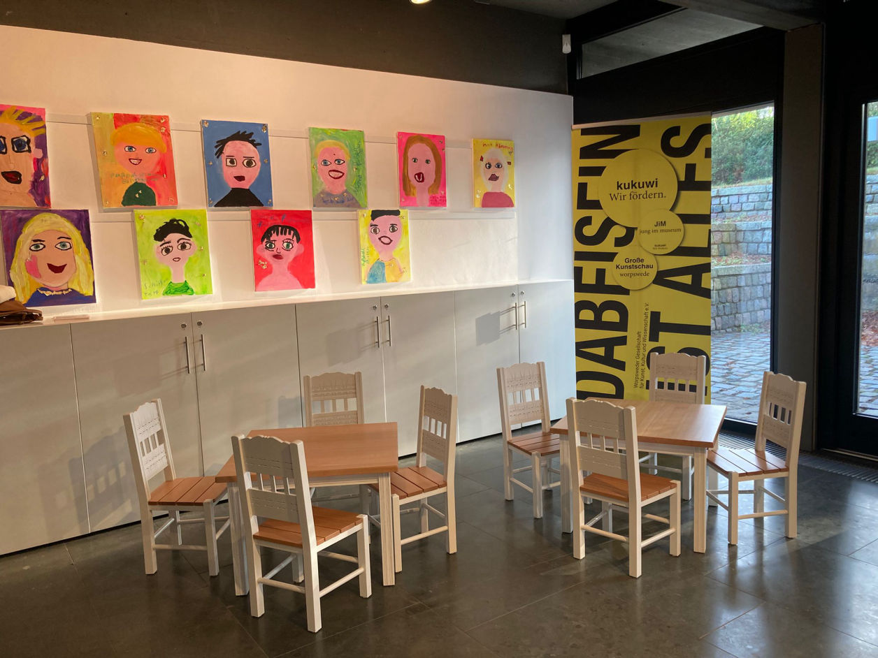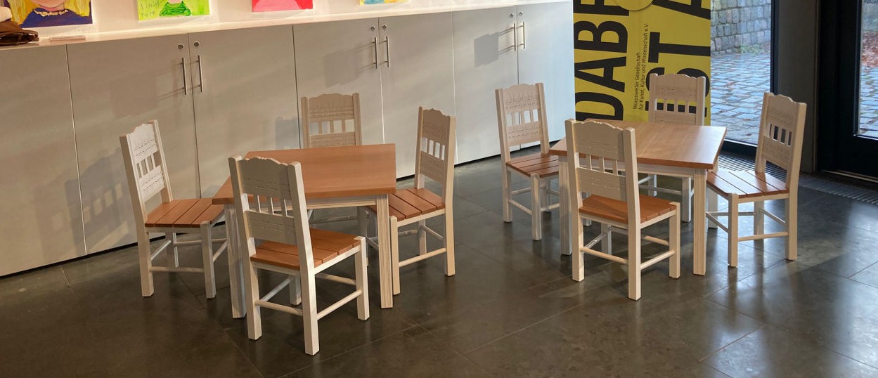 Gleich acht Stühle und zwei Tische ließen wir von kukuwi für die Große Kuntschau herstellen. Es handelt sich hierbei um "Vogeler"-Stühle für Kinder - handwerklich großartig gefertigt von der Tischlerei Kück aus Worpswede.