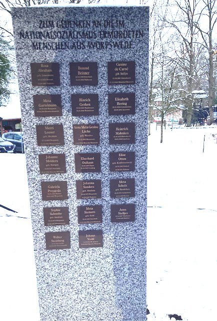 Die Stele aus hellgrauem Granit, gefertigt vom Ottersberger Stein- und Bildhauer Jens Spieler, trägt 20 bronzene Tafeln mit den Namen sowie Geburts- und Sterbedaten von Menschen aus Worpswede, die dem Holocaust, dem NS-„Euthanasie“-Programm, politischer Verfolgung oder der Zwangsarbeit zum Opfer fielen – darunter auch das Kind einer polnischen Zwangsarbeiterin. Eine ergänzende Info-Stele mit QR-Code verweist auf Kurzbiografien und vertiefende Informationen.